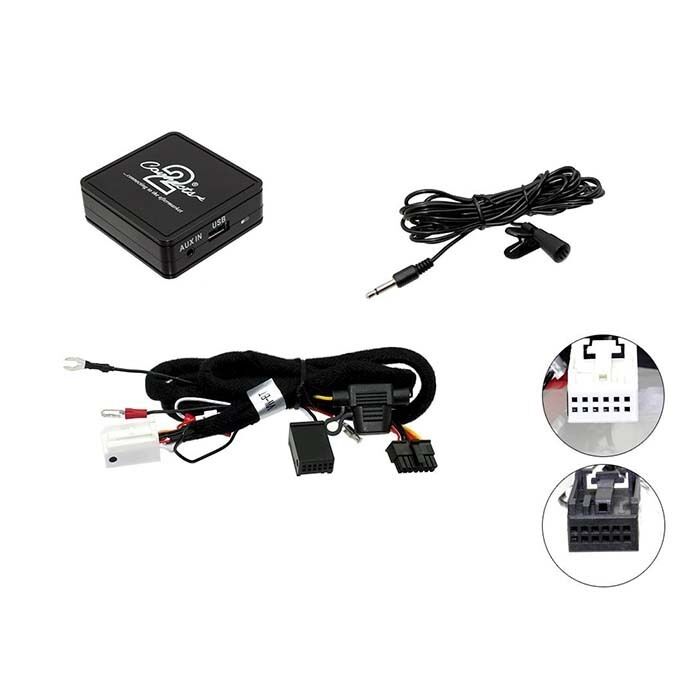 Dette Bluetooth A2DP/Bluetooth interface tillader plug and play-tilslutning til køretøjets OEM-hovedenhed. Interfacet tilsluttes den originale CD-skifterport, hvilket giver mulighed for A2DP-musikstreaming og håndfri funktioner samt en 5V USB-opladningsport og AUX-indgang.