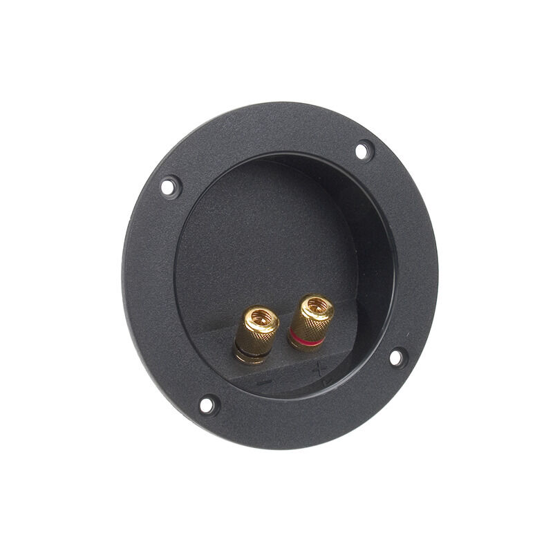This round loudspeaker terminal for plug-in connection 2-poles has gilded connections a diameter of 105 mm and needs a drilling circle diameter of 76 mm.