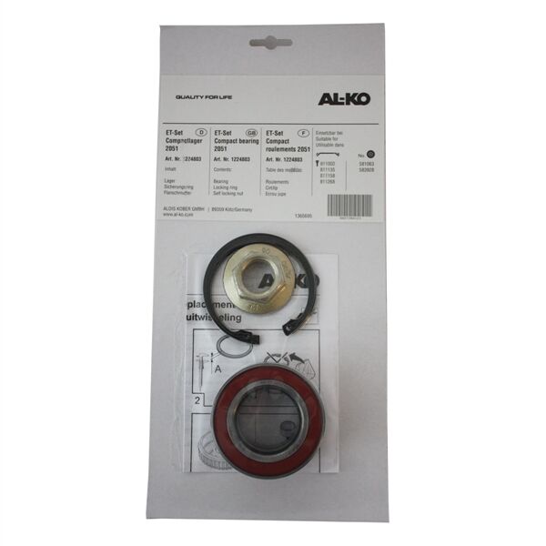 Forstærket variant af AL-KO Type 2051 hjullejesæt med kompaktleje inkl. låsering og møtrik. Bemærk derfor diameteren!