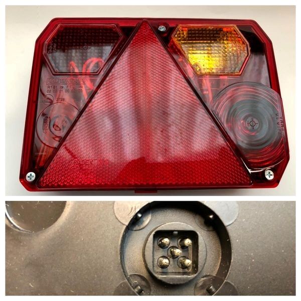 Højre baglygte med blinklys, bremselys, baglys, nummerpladelys og trekantrefleks.