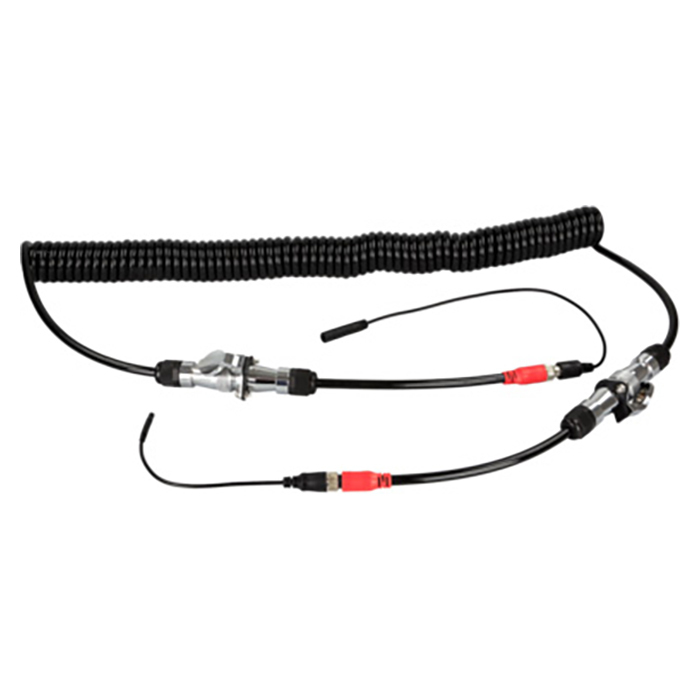 Kamerakabelsæt til trailere og campingvogne, designet til problemfri kablet installation af ACV-kameraer med én kameralinse. Sættet inkluderer patenterede fastgørelser og en spiralledning for nem adskillelse mellem køretøj og trailer. IP66-klassificering sikrer beskyttelse mod støv og vand.