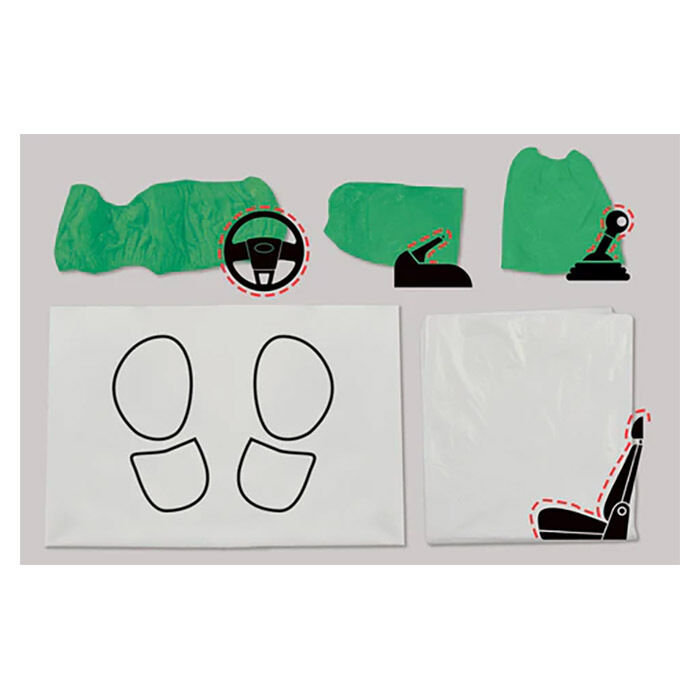Engangssæt, der indeholder en pose med alle de nødvendige beskyttelsesovertræk, der benyttes i en bil under mekanisk vedligeholdelse.