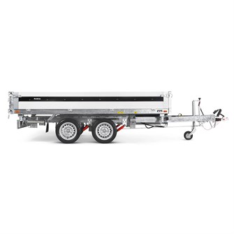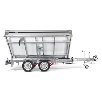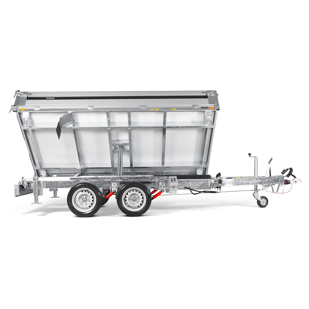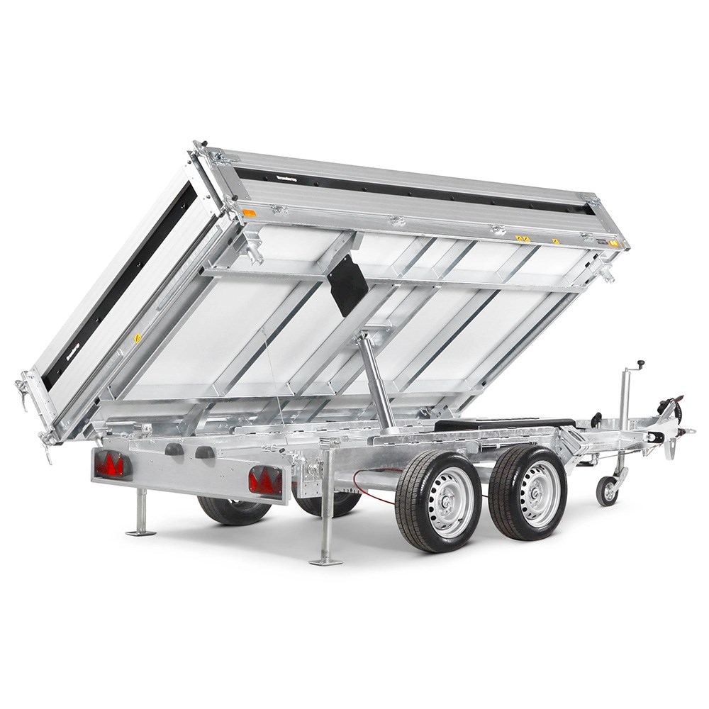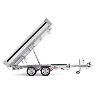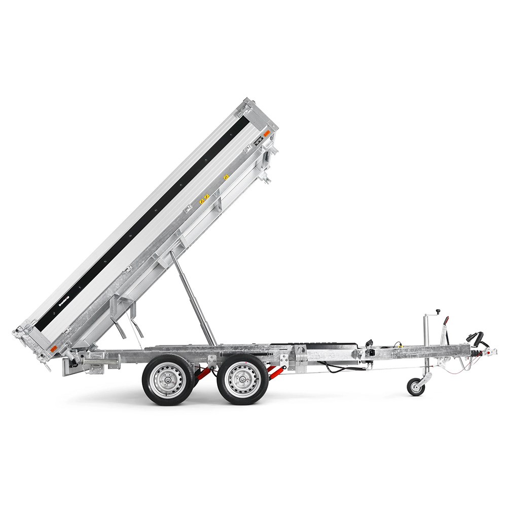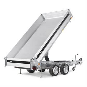 Tippevinklen på 50 grader, og det elektriske hydrauliske tip via en 4-trins tipcylinder på traileren gør det let som en leg at tippe til alle 3 sider og at aflæsse f.eks. grus og jord, hvorved dit daglige arbejde lettes væsentligt. Tipcylinderen har en manuel nødpumpe.