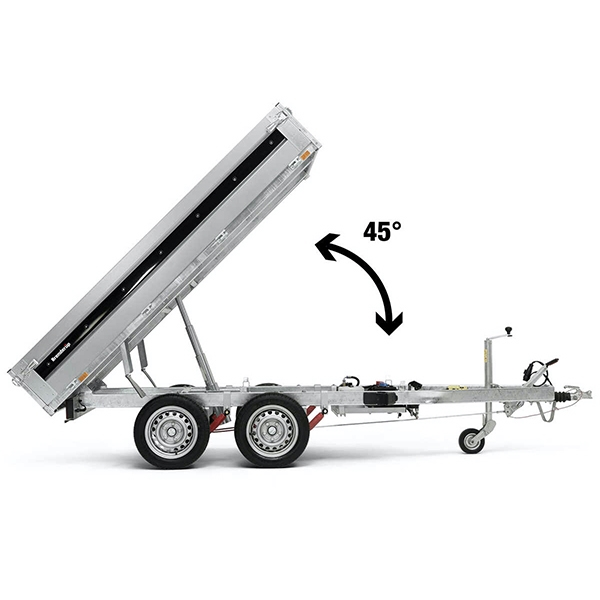 Med en tipvinkel på hele 45° er traileren idéel til transport, og af- og pålæsning af grus og byggeartikler.