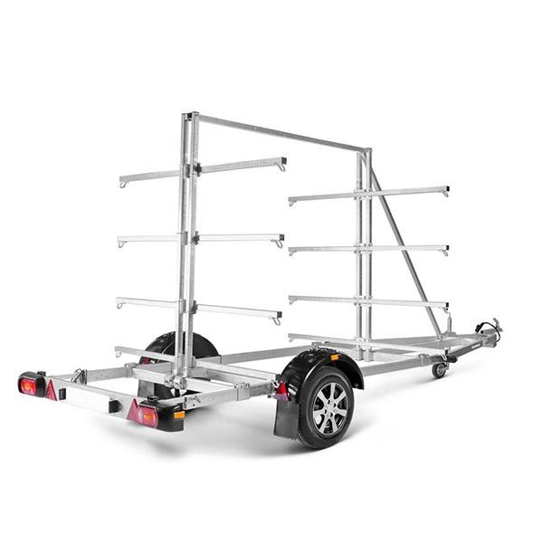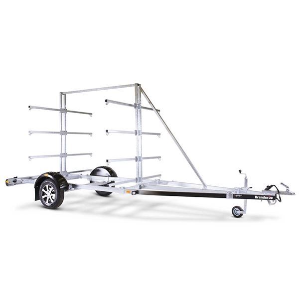 Med denne kano-/kajaktrailer fra Brenderup kan du let transportere op til 16 kajakker eller 8 kanoer. Stativet på traileren er justerbart, så den kan tilpasses størrelsen på dine kanoer og kajakker.