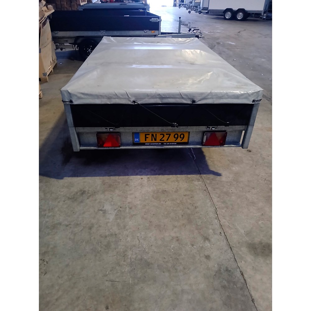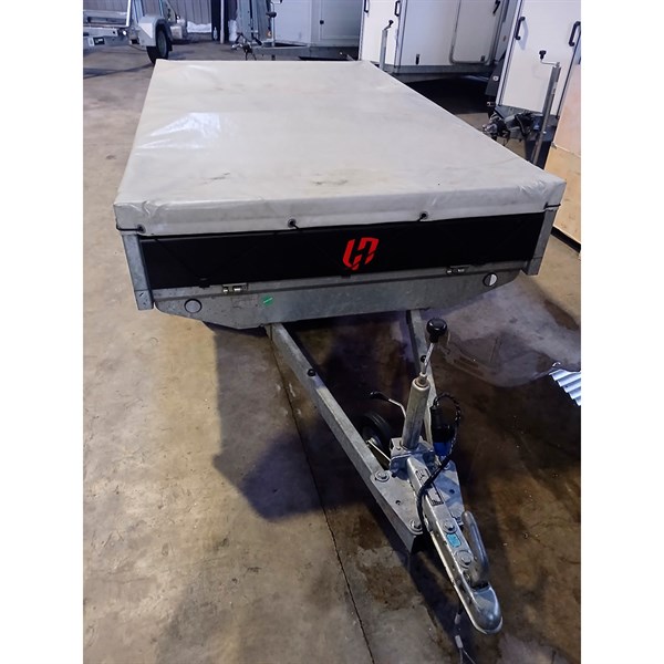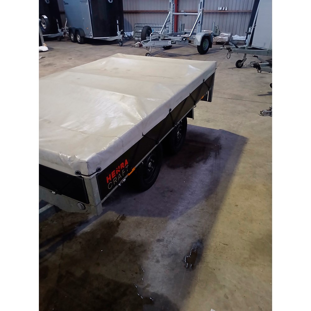 Brugt: Henra Platformtrailer 750 kg Dobbeltakslet - Craft Series - L: 255 x B: 150 cm - Inkl. 3 x bøjler, presenning og komplet næsehjul
