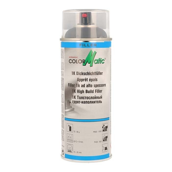 ColorMatic 1K High-Build Filler er et 1K akryl spartelmasse med bedst mulig påfyldnings- og dækkekapacitet. Høj lagtykkelse i en påføring. Hæfter godt til stål, aluminium, polyester og på de fleste plastik overflader. Kan ikke påføres med 1K Grunder (HG1 til HG7) ovenpå.