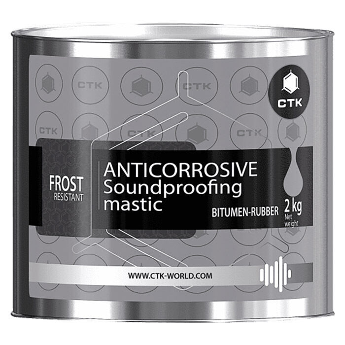 CTK Anticorrosive Soundproofing Mastic er baseret på butylgummi og bitumenadditiver designet til lydisolering og korrosionsbeskyttelse af ydre elementer i bilens karosseri som hjulkasser, bunden mm. med lydabsorberende og vibrationsdæmpende egenskaber.