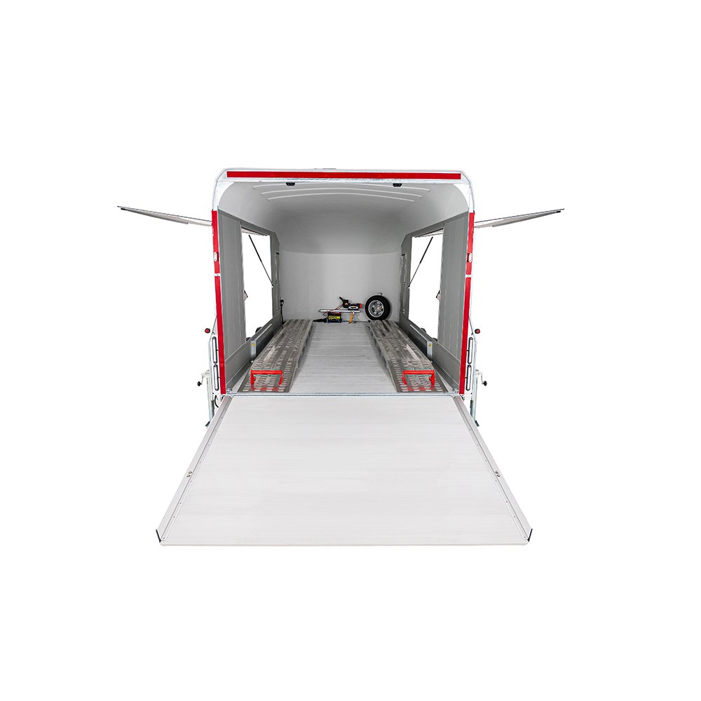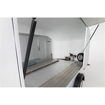 Trailer er udstyret med en praktisk salgsklap i hver side. Derudover har den også en sidedør i hver side, hvilket giver nem adgang og fleksibilitet til både brug og opbevaring.