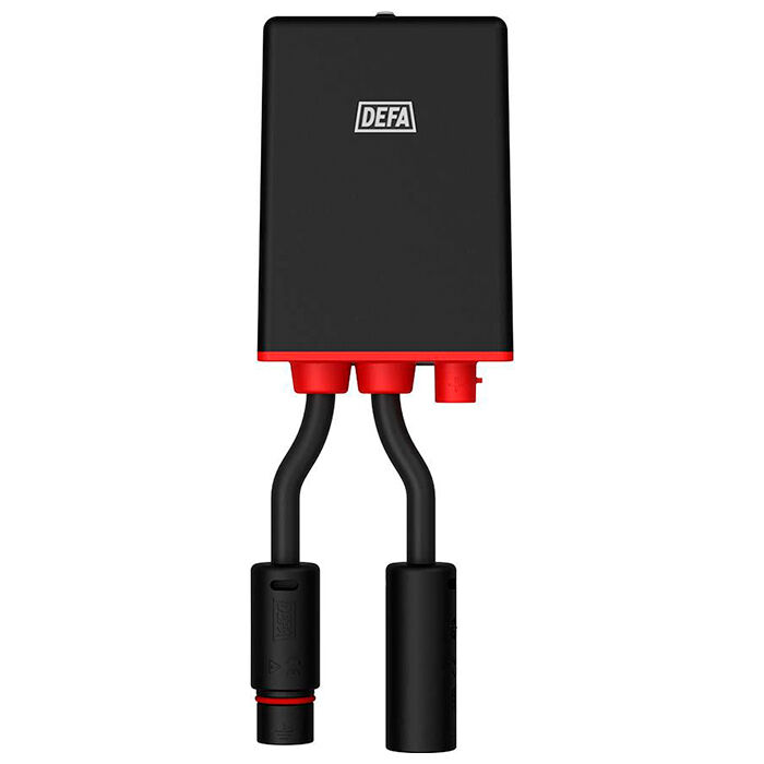Har en 230V Plug-In udgang som kan bruges til at sammenkoble to ladere eller som en udgang til andet DEFA udstyr.