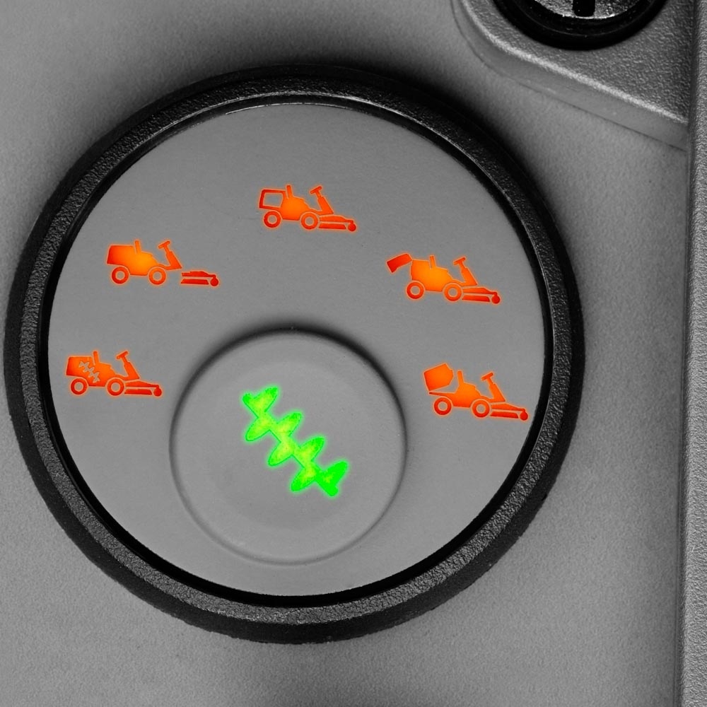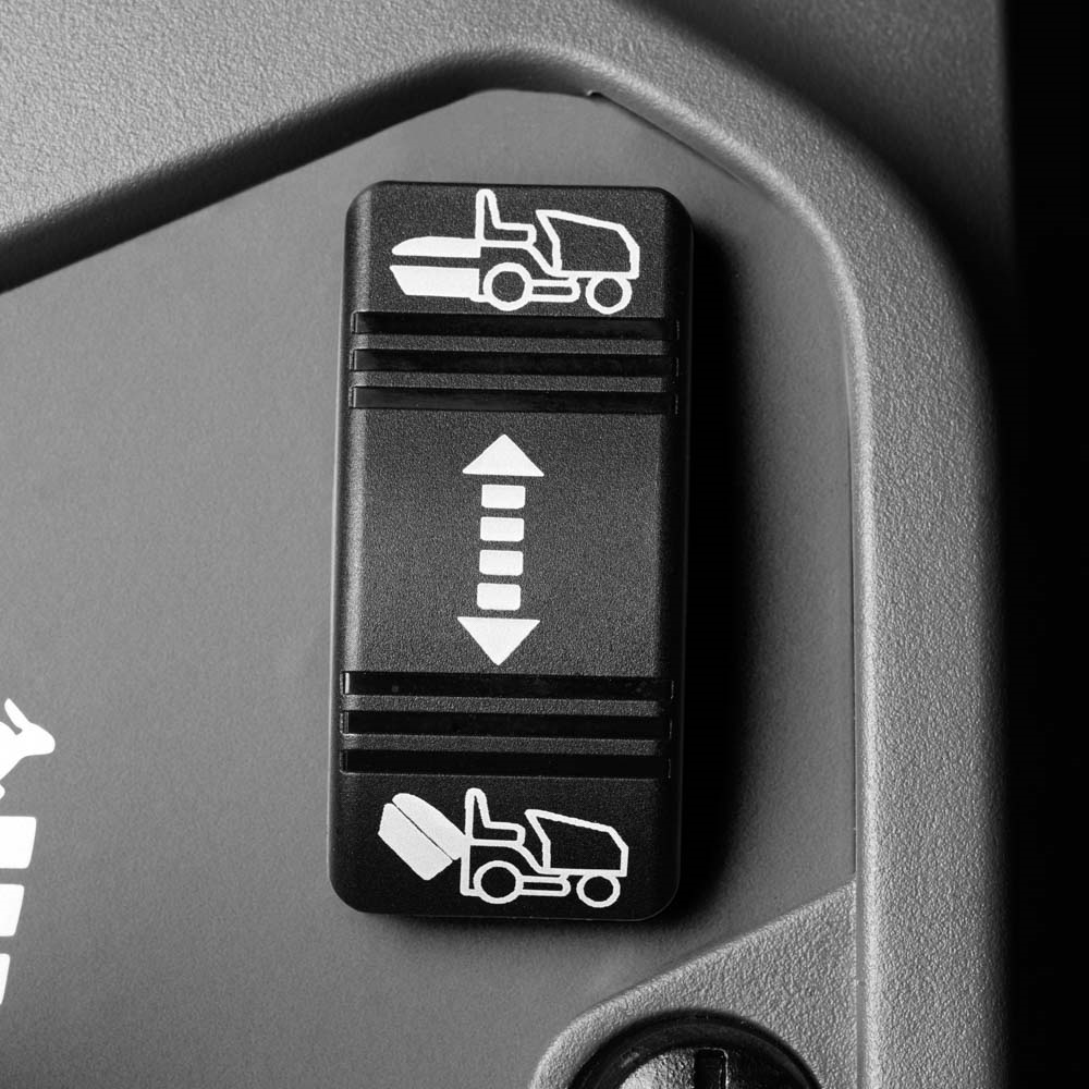 Fra førersædet har du fuldstændig styr på slagets gang. Transmissionen er hydrostatisk af den pedalbetjente type, og selv tømning og styring af opsamleren sker direkte fra førersædet. Du bakker til, trykker på en knap, og så er de 300 liter græs læsset af.