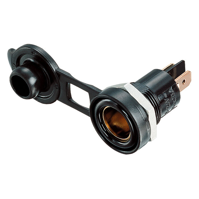12-24 Volt indbygget standardstik med beskyttelsesdæksel, indvendig Ø 11,6 mm, egnet til standard- og universalstik til drift af lys og hjælpemidler i biler, lastbiler, autocampere, motorcykler eller både, til belastninger op til 16 A, stikforbindelser 6,3 mm x 0,8 mm.