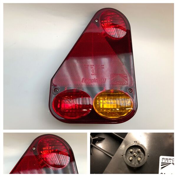 Baglygte til venstre side af traileren med blinklys, bremselys, baglys, tågelys og trekantrefleks.