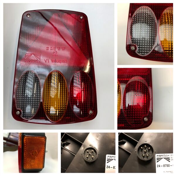 Baglygte med blinklys, bremselys, baglys, tågelys, baklys, sidemarkeringslygte og trekantrefleks.