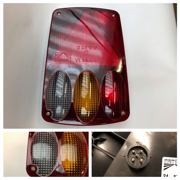 Baglygte med blinklys, bremselys, baglys, baklys og trekantrefleks til højre side af traileren.