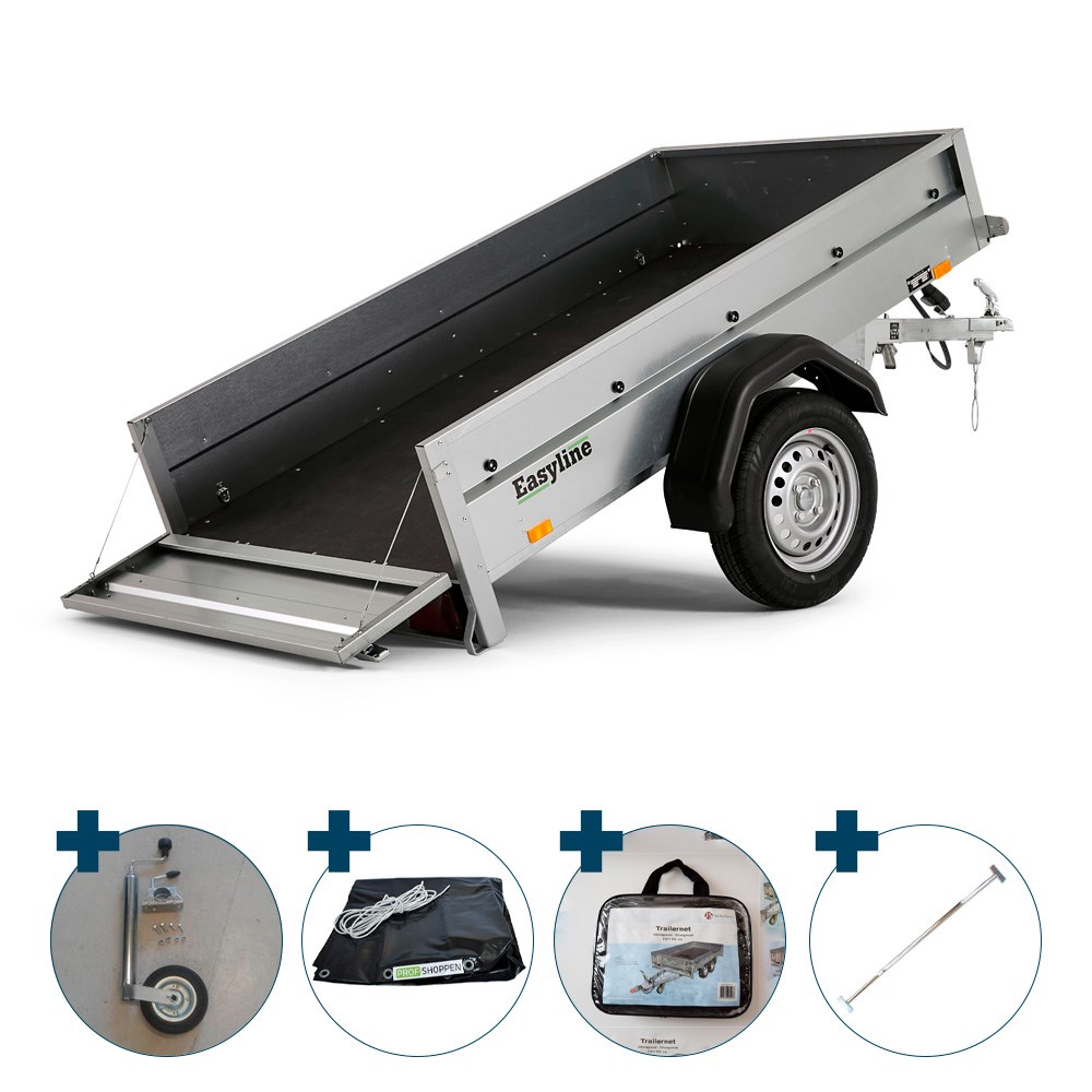 Easyline ES203S UB trailer m. tip inkl. Prof-presenning, presenningsbøjle, trailernet og næsehjul - 500 kg