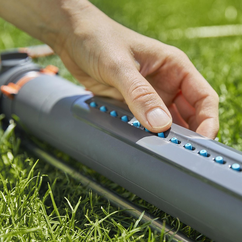 Gardenas serie af vippevandere hedder Aquazoom, og her er der tre størrelsesmuligheder. Denne Aquazoom M er den midterste af slagsen og leverer op til 250 kvadratmeters dækning, mens den større L-model klarer 350 m2.