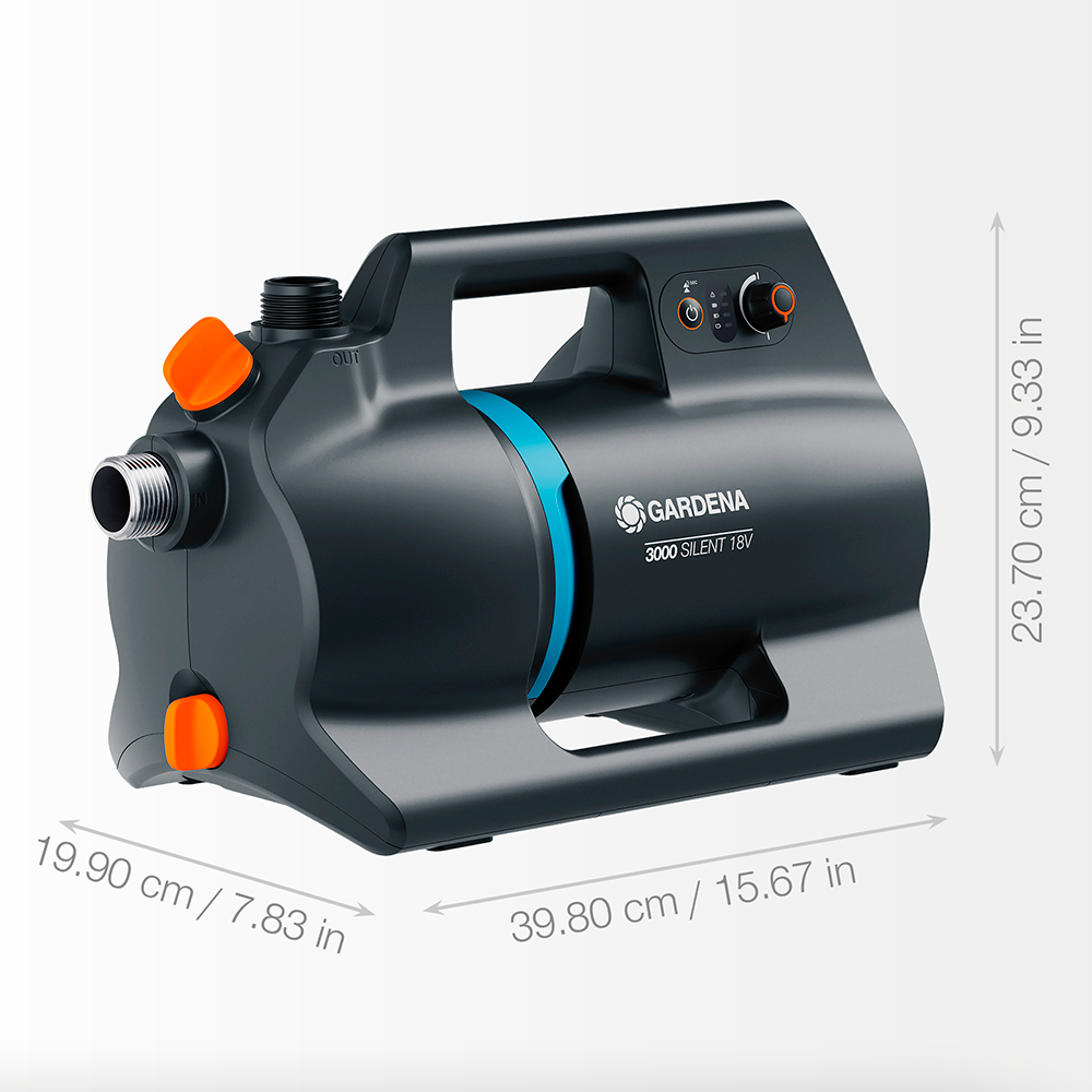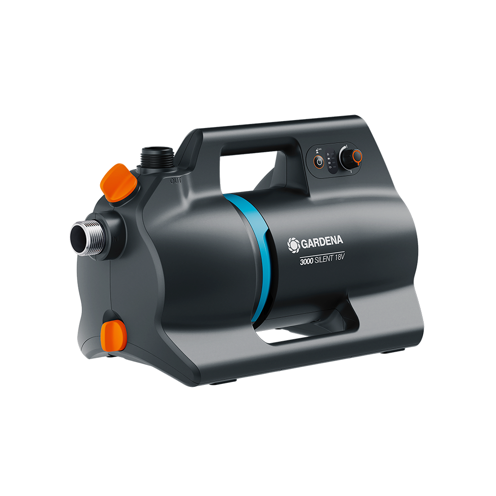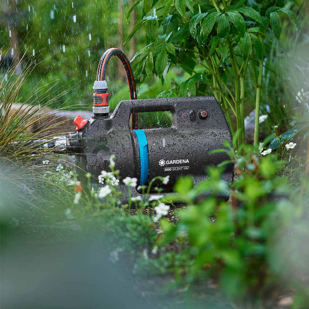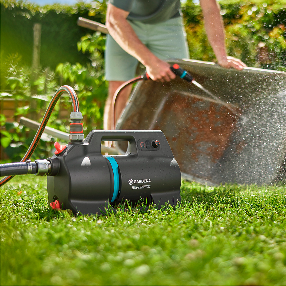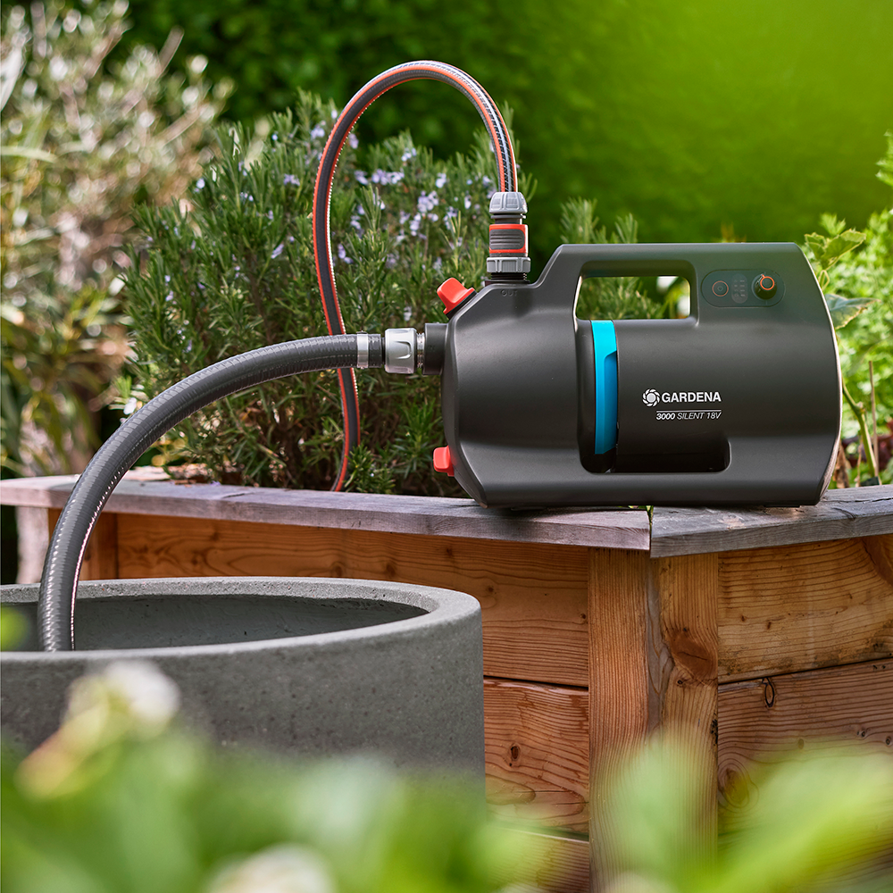 Med den batteridrevne trykpumpe 3000 Silent 18V fra Gardena får du en kraftfuld og fleksibel pumpe, der kan placeres præcis dér, hvor du har brug for vand. Den leverer pålidelig gennemstrømning fra brønde, cisterner eller regnvandstønder og sikrer stabil vandforsyning til vanding af buske, blomster og græsplæner uden brug af fast strømtilslutning.