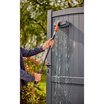 For at opnå de bedste rengøringsresultater kan børsten kombineres med GARDENA's vandførende skafter. Ved at tilføje GARDENA sæbe direkte i dispenseren på skaftet kan rengøringskraften forstærkes markant. Dette gør det muligt at dosere sæben efter behov og sikre en mere intensiv og effektiv rengøring af overfladerne.