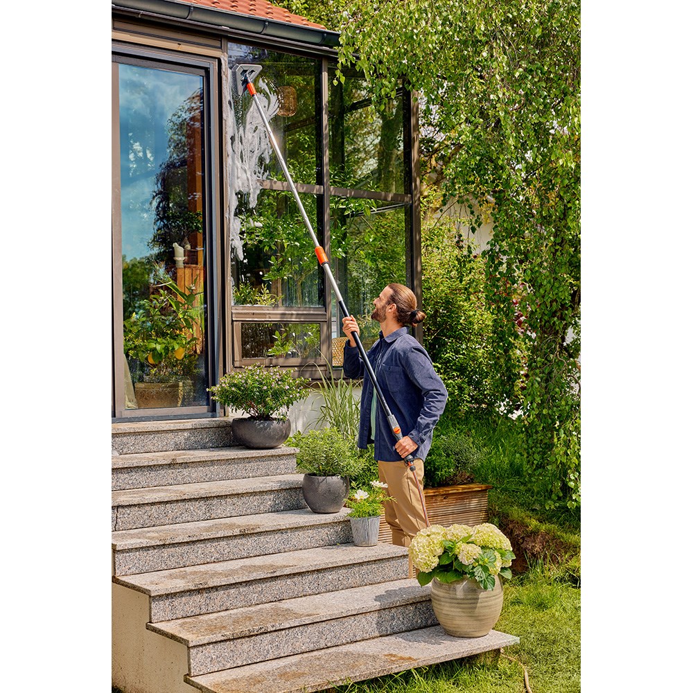 Med GARDENA Cleansystem Teleskopskaft M-XL får du en professionel og brugervenlig løsning til rengøring af høje og vanskeligt tilgængelige områder - uden besvær.