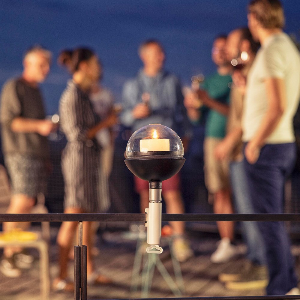 Underdelen af lampen og låget på glaskuplen er fremstillet af metal, og glaskuplen beskytter lyset mod vind og regn, så lyset kan brænde klart og roligt.