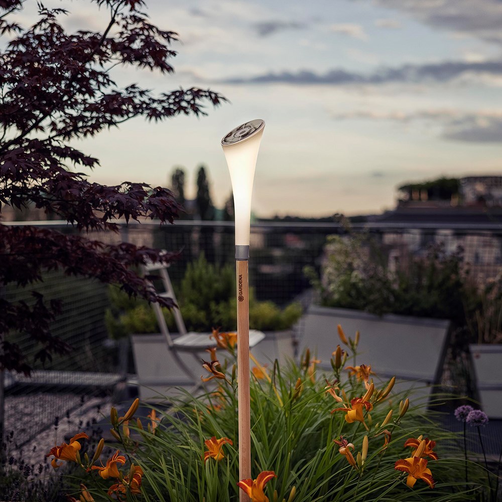 Til Gardenas ClickUp!-system fås også denne stilrene lampe, som kører på solenergi og giver et blødt og stemningsfuldt lys.