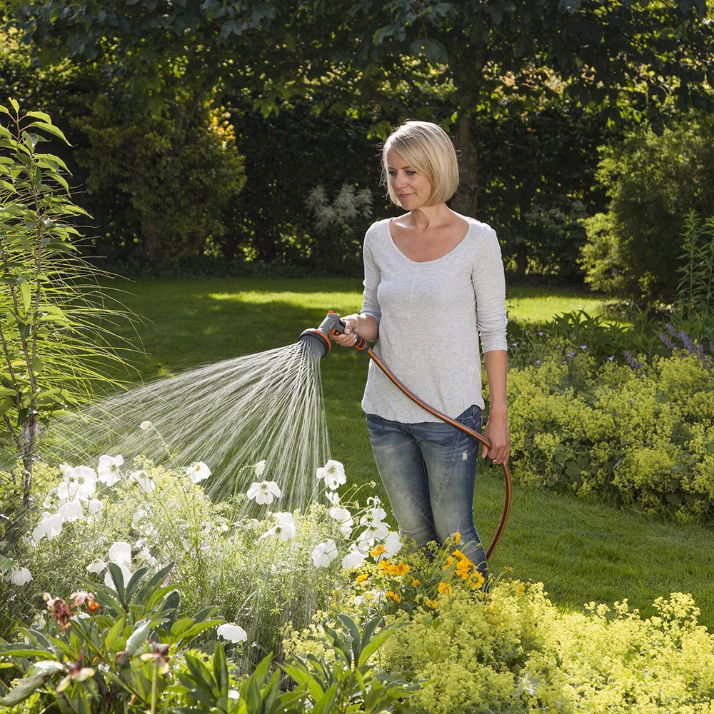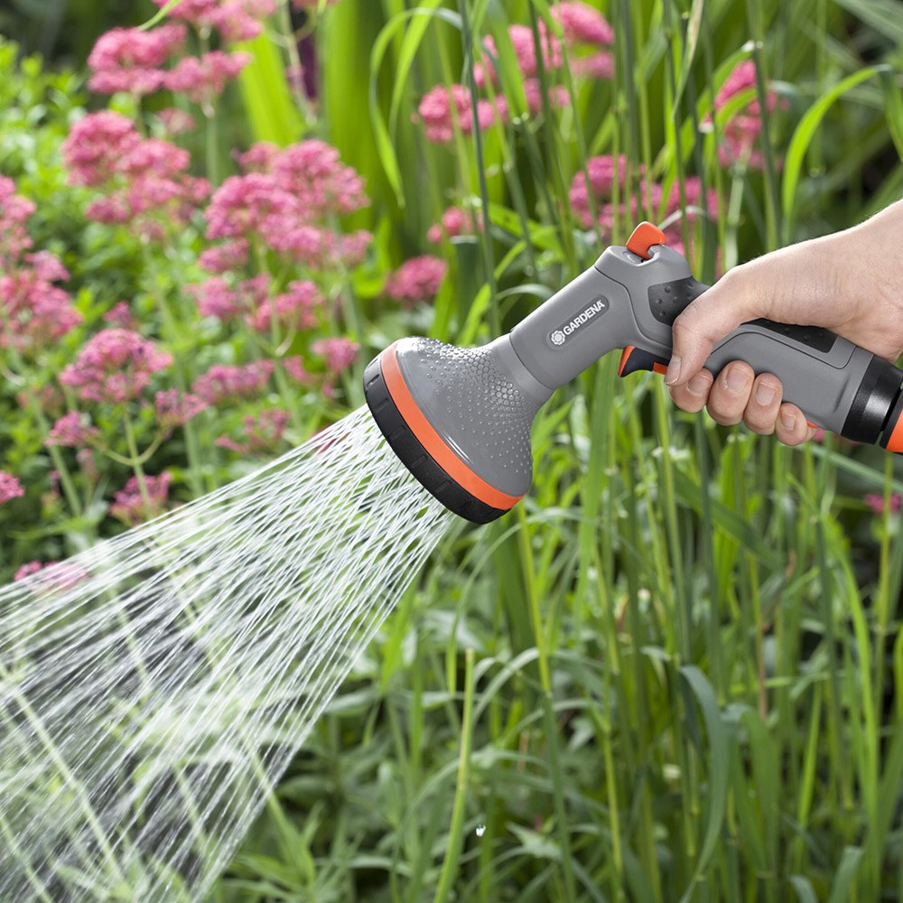 Her får du et komfortabelt greb og to forskellige, bløde sprøjtemønstre, som gør sprøjten til et perfekt valg, når blomsterne skal vandes. Pistolen kan sprøjte blødt og smalt samt blødt og bredt. Der er desuden justerbart vandtryk.