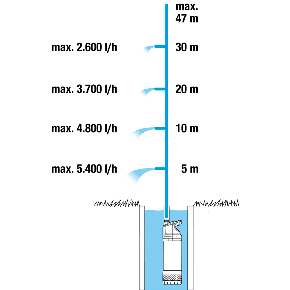 Pumpens diameter på kun 149 mm gør den ideel til smalle brønde og beholdere fra 150 mm og opefter. Den er fremstillet i rustfrit stål hele vejen igennem – både hus, aksel og gevind – hvilket giver høj robusthed og lang holdbarhed under vand. For nem installation medfølger et 23 meter fastgørelsestov og et 20 meter strømkabel, som gør det let at sænke pumpen sikkert og fleksibelt i dybere brønde. Ved brønde med bundfald kan pumpen kombineres med et flydende sugesæt som ekstra tilbehør.