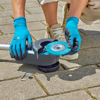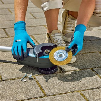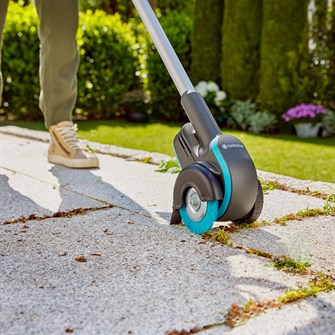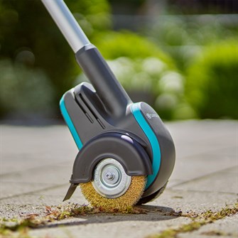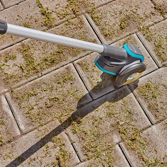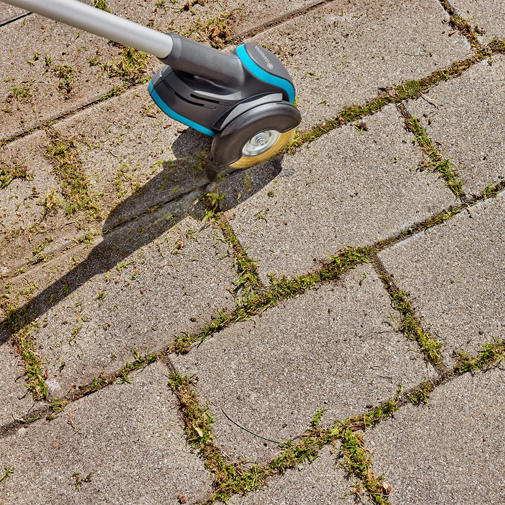 Fremadrettet fugerensning med GARDENA EasyWeed 1800/18V sættet forenkler og strømliner fjernelsen af ukrudt mellem fliser med sit effektive, batteridrevne design.
