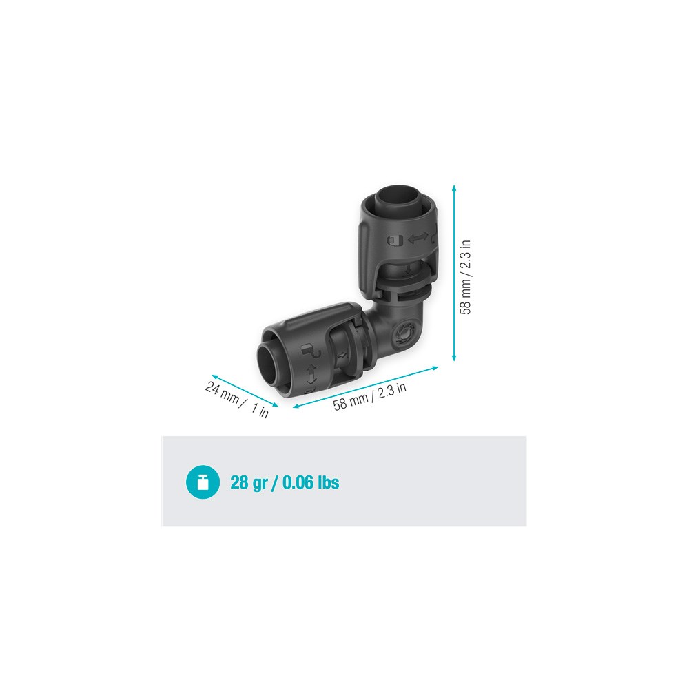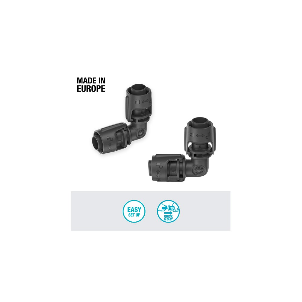 L-stykket gør det muligt at justere retningen på dit hovedrør eller drypvanderen med stor nøjagtighed. Pakken indeholder to L-stykker, som er perfekte til at skabe en 90° vinkelændring i 13 mm rør. Dette betyder præcis styring af vandingen til specifikke områder, som f.eks. bedkanter.