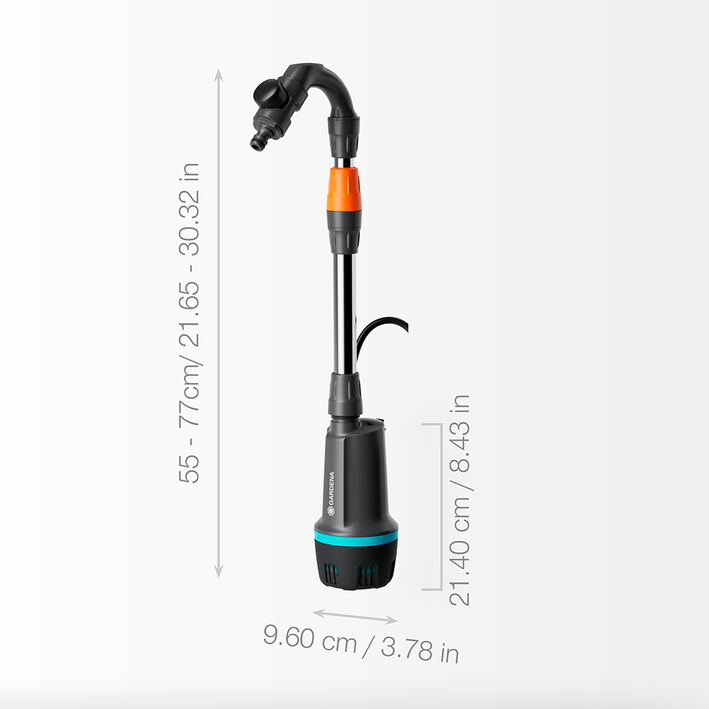 Det justerbare teleskoprør i aluminium (595–1010 mm) passer til en bred vifte af regnvandstønder, herunder IBC-tanke. Pumpens slanke, ledningsfri design gør det let at nedsænke den i åbninger helt ned til 100 mm. Den batteridrevne konstruktion giver fuld fleksibilitet, når du vil vande steder uden adgang til strøm.