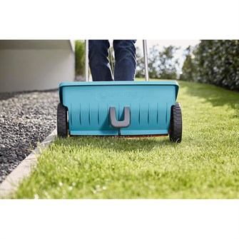 Gardena-sprederen er lavet i stærke materialer, som klarer alt fra gødning til salt uden at tage skade. Derfor er der også 25 års fabriksgaranti på sprederen, som drives af de store hjul med kuglelejer.