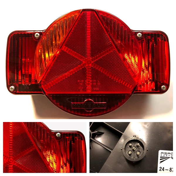 Baglygte til venstre side af traileren med nummerpladelys, baglys, bremselys, blinklys, tågelys og baklys.