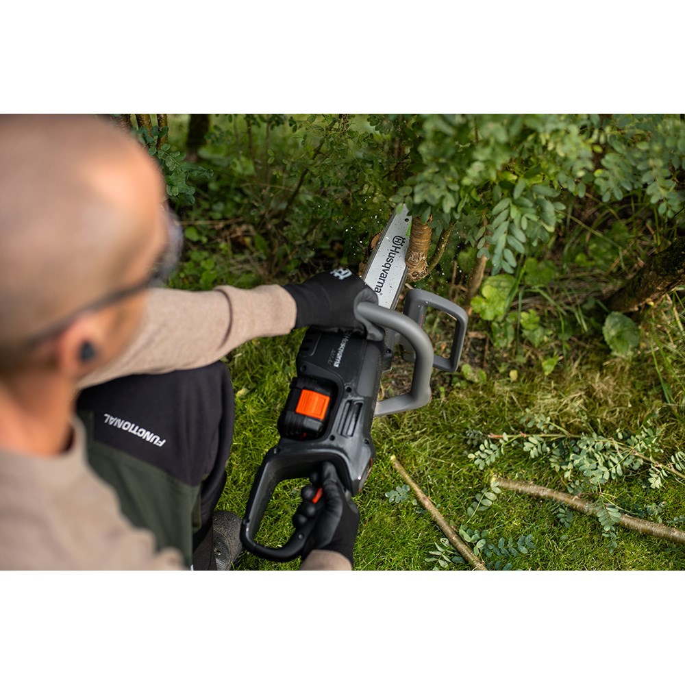 Den batteridrevne Aspire™-kædesav fra Husqvarna er designet til effektiv beskæring, vedligeholdelse af haven, mindre træfældningsopgaver og gør-det-selv-projekter. Med et præcisionssværd, en fin kæde og høj skærehastighed leverer saven præcise snit, selv på vanskeligt tilgængelige steder. De nøjagtige snit er skånsomme mod træernes sundhed og sikrer en flot finish til tømrerarbejde og andre detaljerede projekter.