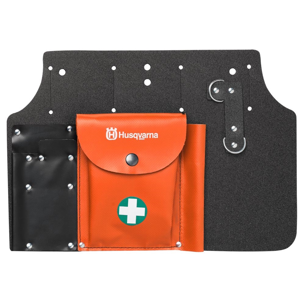 Bagstykket har en stor lomme til bl.a. et førstehjælpssæt, plads til en karburatorskruetrækker, en reservekæde og generel opbevaring samt en holder til en kombinøgle, en fil og et filmål.