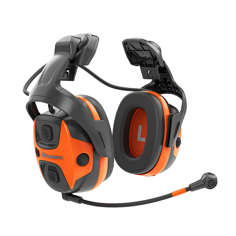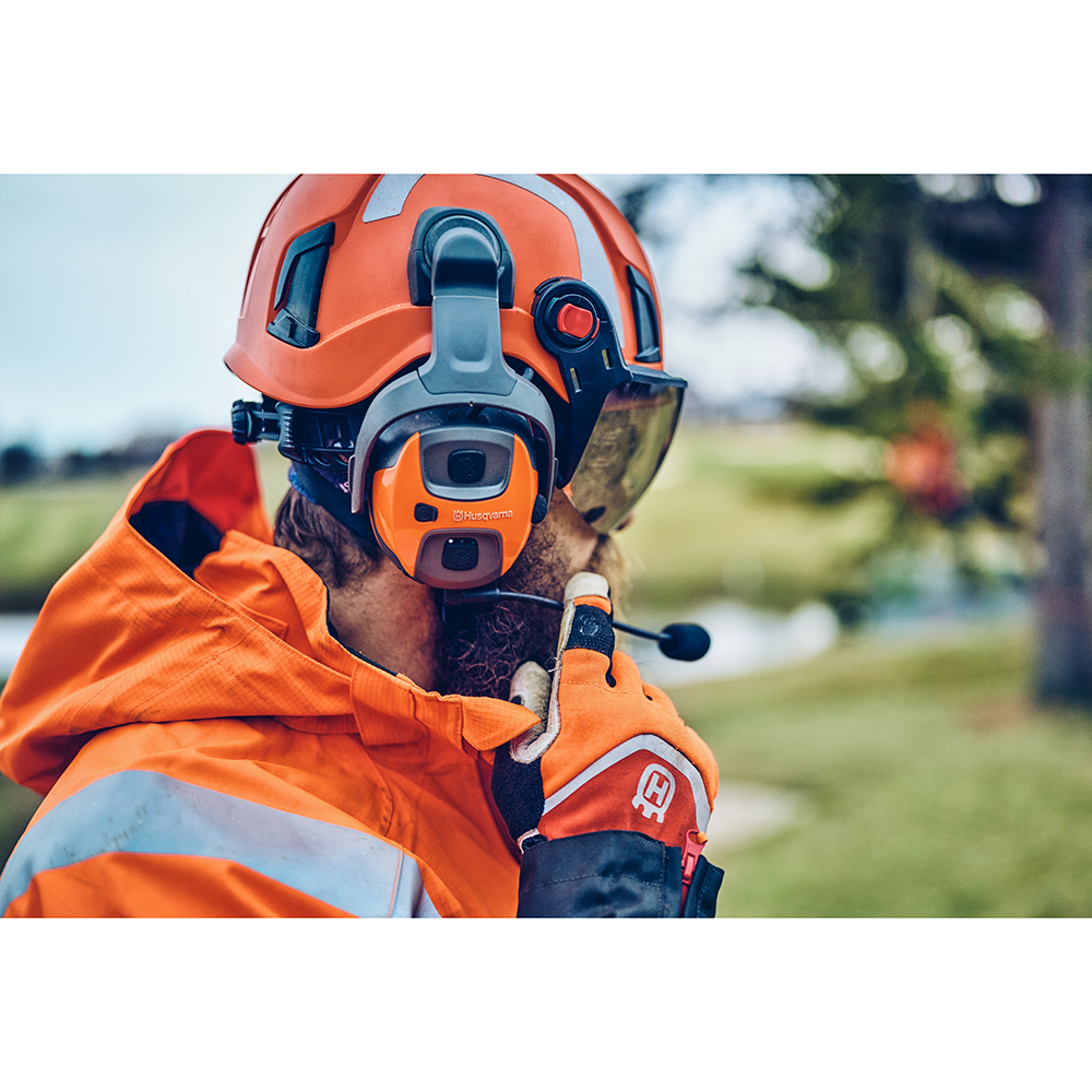 Det robuste og behagelige høreværn lader dig høre vigtige omgivende lyde, mens du kan tilslutte enheder via Bluetooth® og endda tilføje eksterne deltagere til samtalen via telefon. Systemet er kompatibelt med Husqvarna Technical- og Arborist Spire-hjelme og leveres med to adaptere, så det kan tilpasses flere hjelmtyper.
