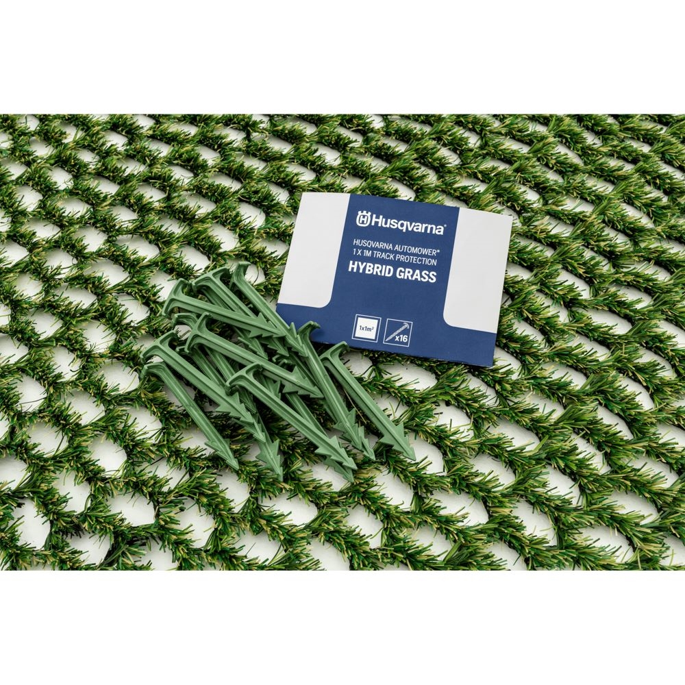 Husqvarnas hybridgræs er en måtte af kunstgræs, som falder i med den rigtige græsplæne og giver robotten bedre greb på skråninger.