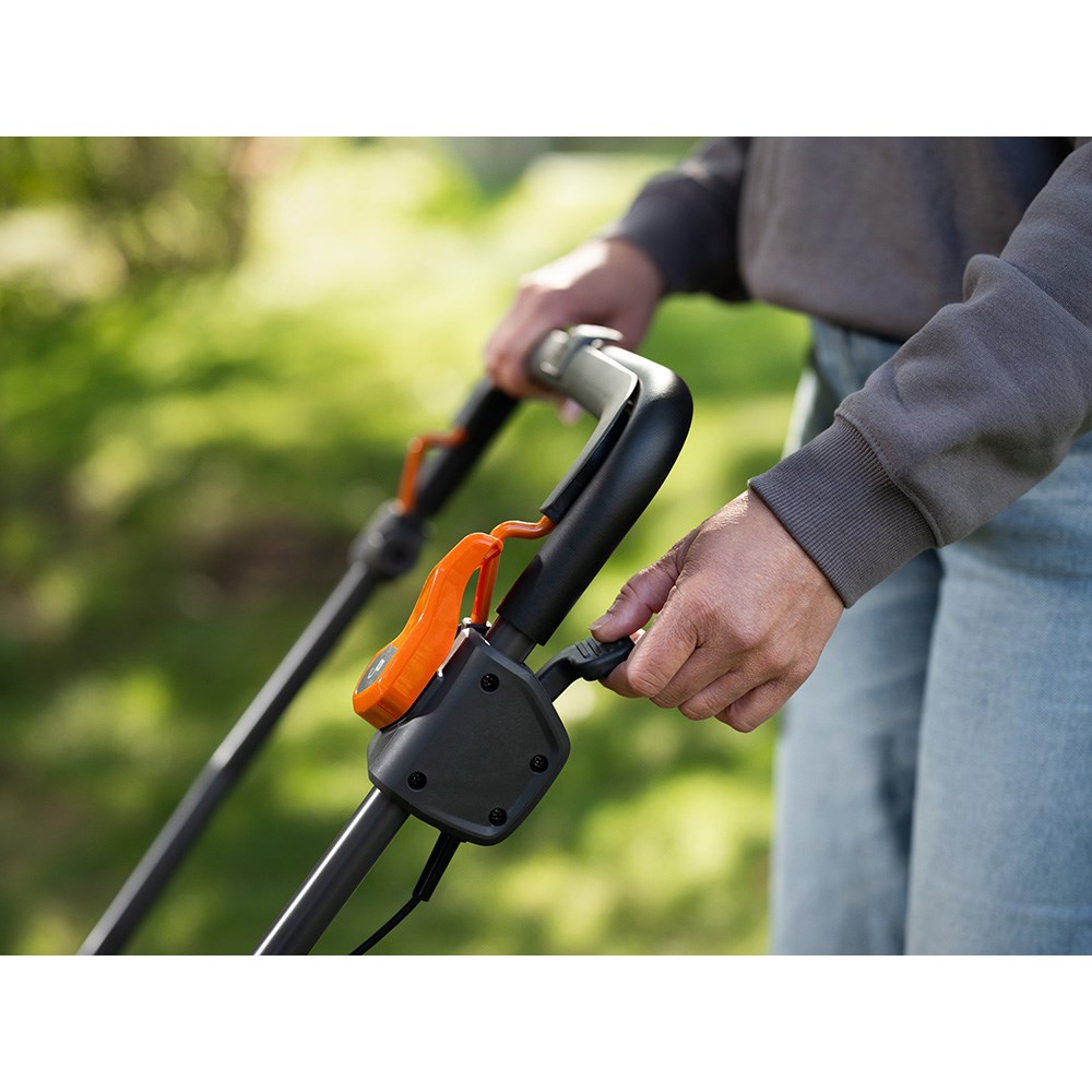 Plæneklipperens forhjulstræk og kompakte stålklippebord sikrer nem manøvrering, selv på ujævne overflader. Med praktiske funktioner som bail og bail stop er det let at starte og stoppe klipningen uden risiko for utilsigtede opstarter.