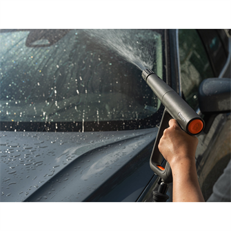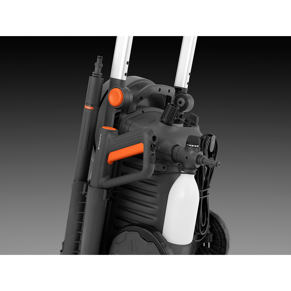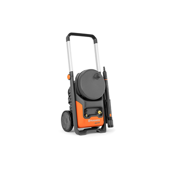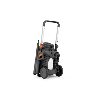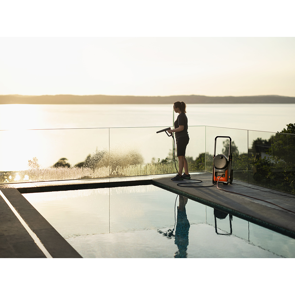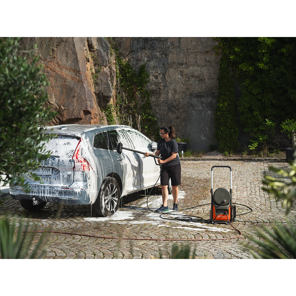 PW 370 har en ekstra lang, fleksibel slange, der giver større rækkevidde og nem betjening. Designet inkluderer foldbart aluminiumshåndtag, store hjul med blød slidbane for godt greb i udfordrende terræn samt indbygget opbevaring til tilbehør, så alt nødvendigt udstyr er lige ved hånden. Slangeoprulleren med støttestyr gør det hurtigt og enkelt at rulle slangen op efter brug.