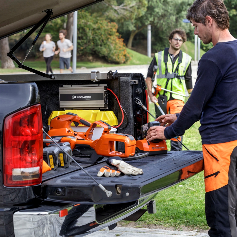 Husqvarnas inverter er god at have i marken, da den konverterer 12 volt fra ethvert bly/syrebatteri til 220 volt til enten QC80 eller QC330-ladere.
