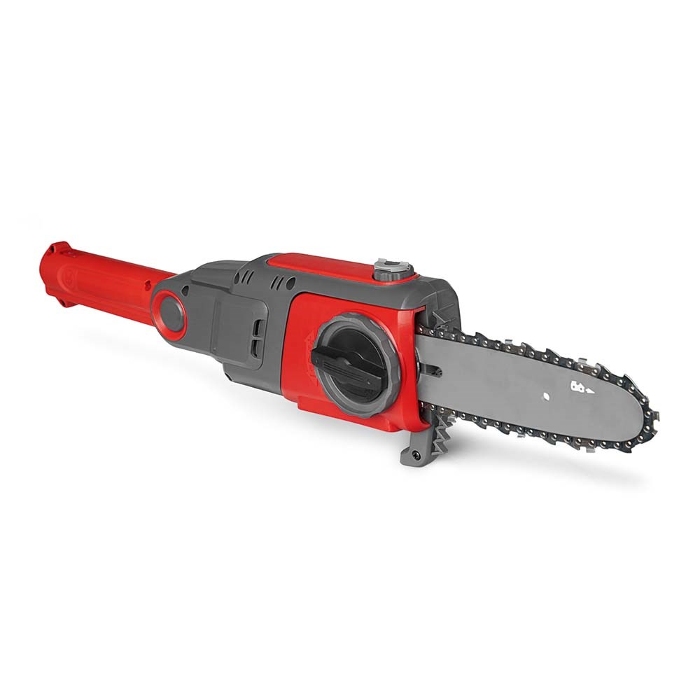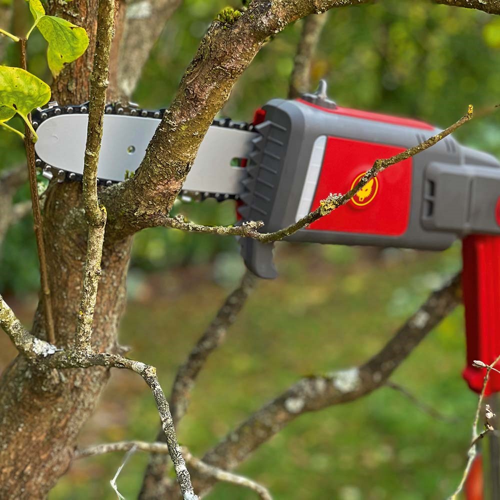 Den lille fleksible kædesav har et sværd på 20 cm og og et svingbart hoved, hvorved du nemmere vil kunne trimme alle dele af træer og buske med saven, stående trygt og sikkert på jorden og med bedst mulig ergonomi.