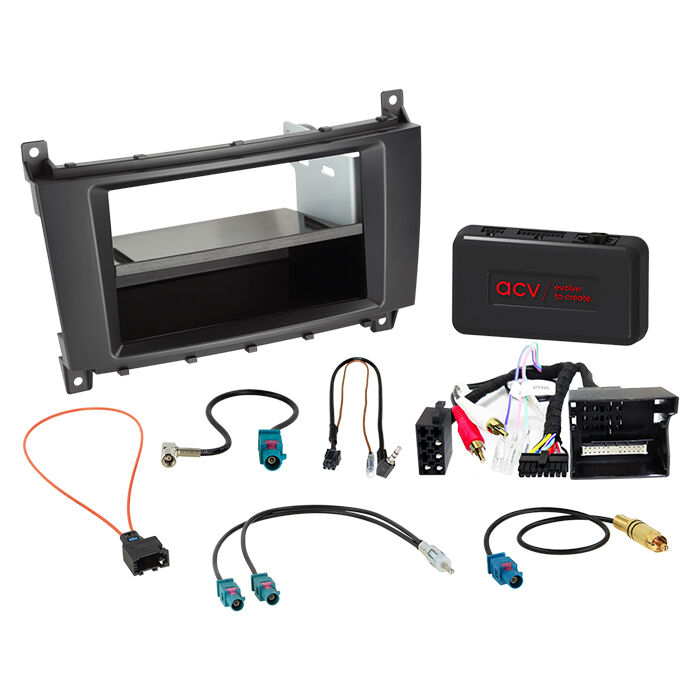Komplet 2-DIN monteringssæt til Mercedes, der gør det muligt at udskifte bilens originale headunit med en eftermarkeds 2-DIN radio, samtidig med at du får en pæn OEM-lignende finish og et praktisk opbevaringsrum. Kittet er udviklet til biler med CAN Bus og passer til systemer med MOST25-forstærker via RCA tilslutning.