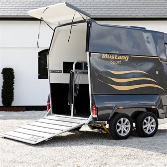 Denne nylonstrop fra Mustang Trailers passer til bagklappen på mærkets hestetrailere. Stroppen bruges til at holde den øverste del af bagklappen åben.
