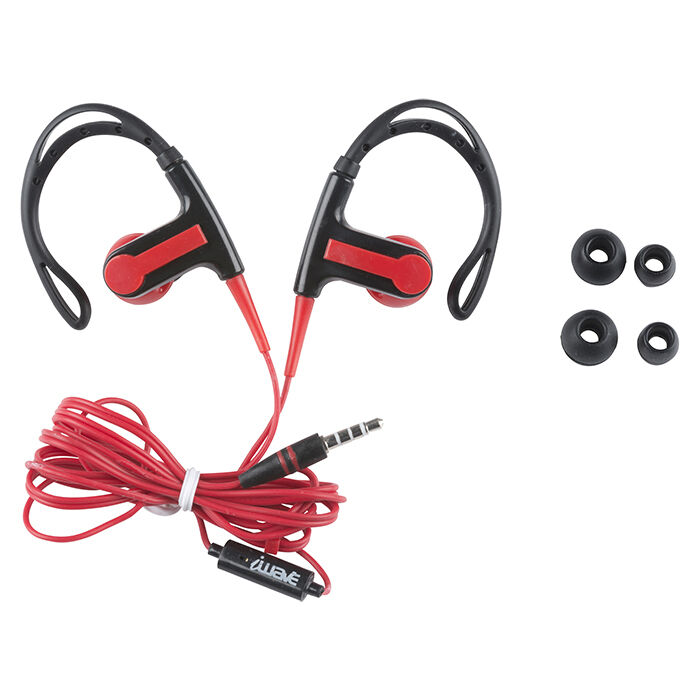 Grundig øretelefoner i enten rød eller sort, med mikrofon
