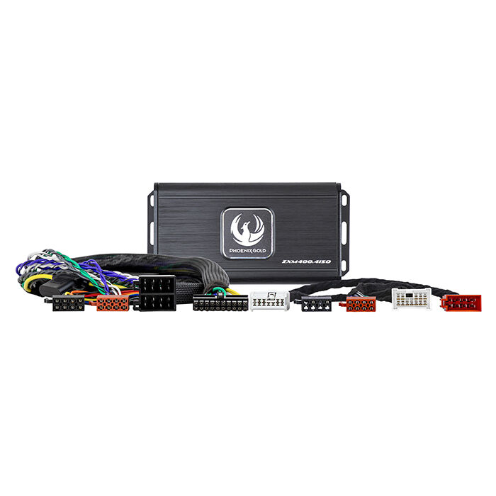 Systemets hjerte er Phoenix Gold ZXM400.4ISO – en kompakt 4-kanals Class D forstærker med 4 x 60 watt RMS. Den leverer væsentligt mere kraft og kontrol end det originale lydsystem.