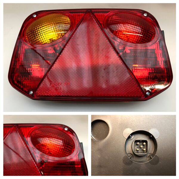Venstre baglygte med bremselys, blinklys, tågelys, baglys og trekantrefleks.
