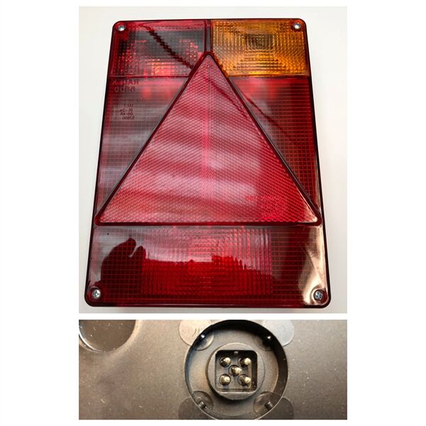 Højre baglygte med bremselys, blinklys, baglys, tågelys og trekantrefleks.