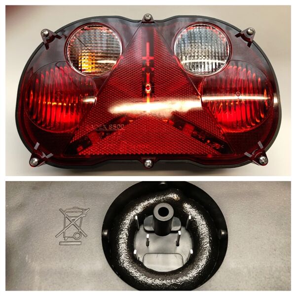 Højre baglygte med blinklys, baklys, LED-baglys, bremselys, tågelys og trekantrefleks.