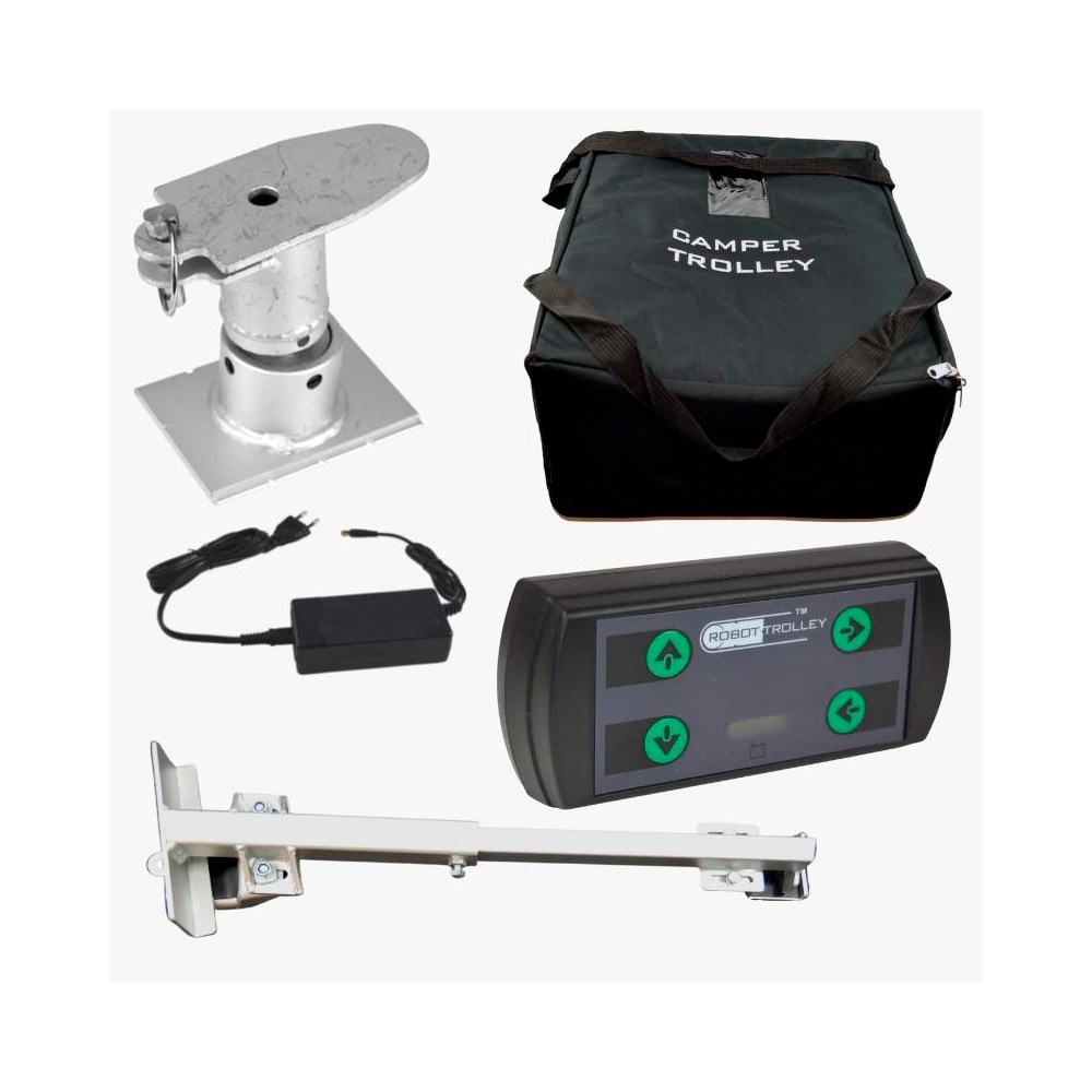 Klar til brug: Robot Trolley leveres klar og samlet. Der medfølger fjernbetjening, oplader, monteringsbeslag, lavt tårn og opbevaringstaske.