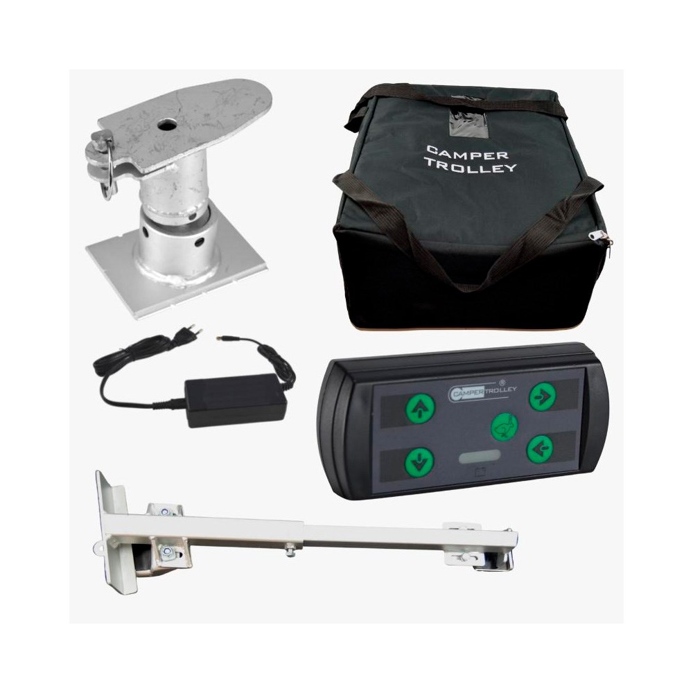 Klar til brug: Robot Trolley leveres klar og samlet. Der medfølger fjernbetjening, oplader, monteringsbeslag, lavt tårn og opbevaringstaske.